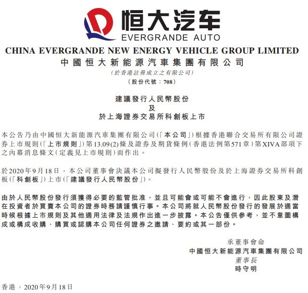 9月17日,恒大汽車發(fā)布公告稱,擬發(fā)行人民幣股份在上??苿?chuàng)板上市,這意味著恒大汽車有望成為第一家科創(chuàng)板上市的新能源車企。
