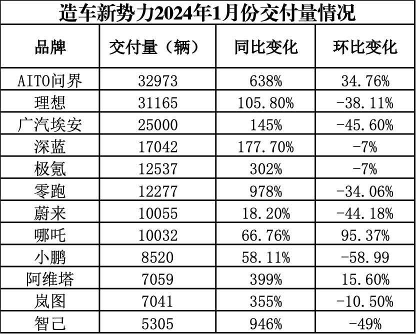 相比2023年12月份,造車新勢力1月份交付量整體下滑了大約30%,部分車企更是超過50%。
