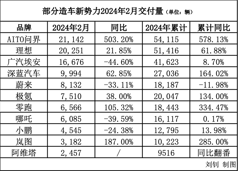 近日,多家造車新勢力陸續(xù)公布2024年2月份交付成績單。受到春節(jié)假期和減少的工作日等客觀因素影響,絕大多數(shù)造車新勢力2月份交付量表現(xiàn)一般,甚至環(huán)比均出現(xiàn)下滑,統(tǒng)計中11家車企,2月份交付量突破萬輛的僅有3家。其中,AITO問界以21142輛交付量再次奪得造車新勢力月度交付量冠軍,理想汽車以20251輛交付量惜敗AITO問界排名第二,廣汽埃安則以16676輛交付量成績排名第三。