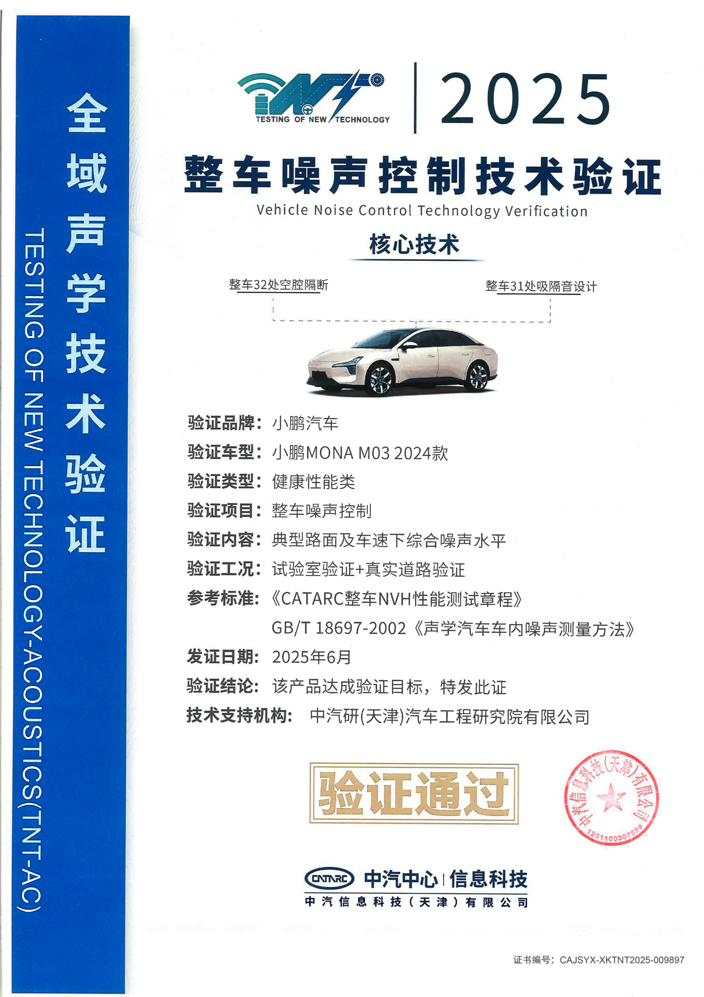 本報(bào)訊 (記者劉釗)近日,小鵬MONAM03榮獲中國汽車技術(shù)研究中心(以下簡稱“中汽研”)頒發(fā)的《整車噪聲控制技術(shù)驗(yàn)證》認(rèn)證,成為首個通過該項(xiàng)認(rèn)證的車型。這項(xiàng)認(rèn)證不僅是對MONAM03整車靜謐性的權(quán)威背書,也標(biāo)志著小鵬MONA在健康座艙、舒適駕乘領(lǐng)域的研發(fā)實(shí)力再次獲得行業(yè)認(rèn)可。