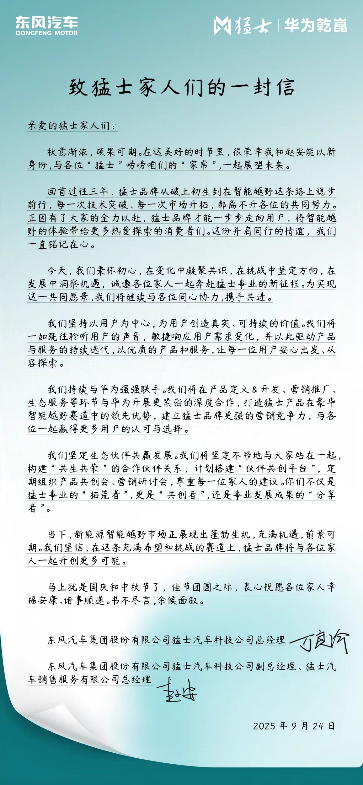 “我們將在產(chǎn)品定義和開發(fā)、營銷推廣、生態(tài)服務(wù)等環(huán)節(jié)與華為開展更緊密的深度合作,打造猛士產(chǎn)品在豪華智能越野賽道中的領(lǐng)先優(yōu)勢,建立猛士品牌更強(qiáng)的營銷競爭力。”這封家書,正將這份戰(zhàn)略合作的構(gòu)想,推向新的高度。