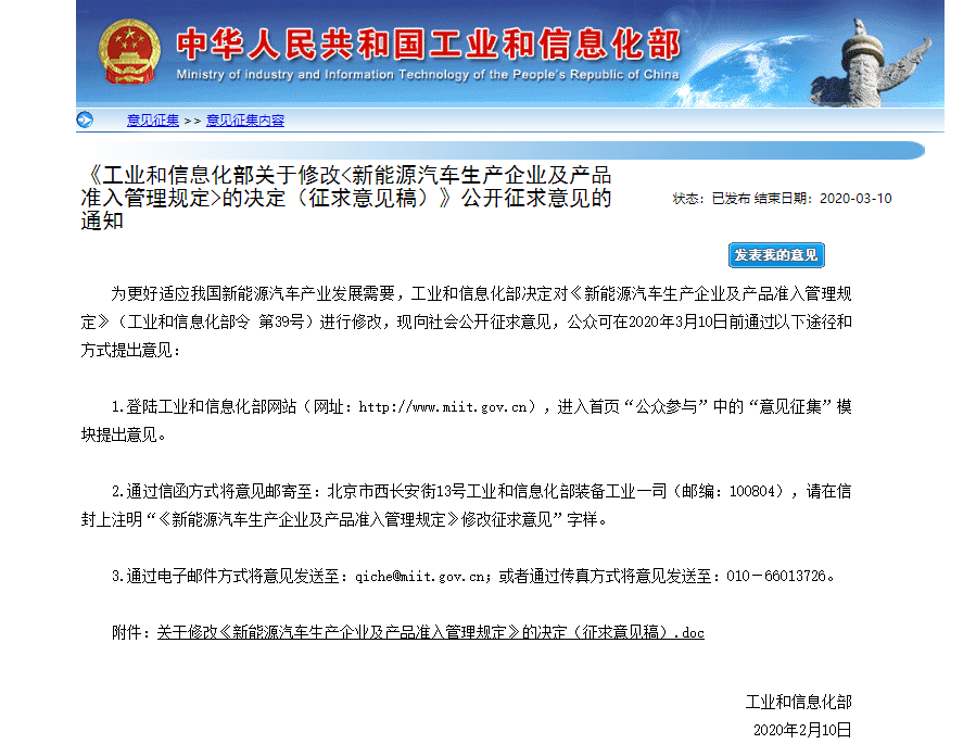 為更好適應(yīng)我國新能源汽車產(chǎn)業(yè)發(fā)展需要,2月10日,工信部發(fā)布《工業(yè)和信息化部關(guān)于修改新能源汽車生產(chǎn)企業(yè)及產(chǎn)品準(zhǔn)入管理規(guī)定的決定(征求意見稿)》公開征求意見的通知,現(xiàn)向社會公開征求意見,公眾可在2020年3月10日前提出意見。