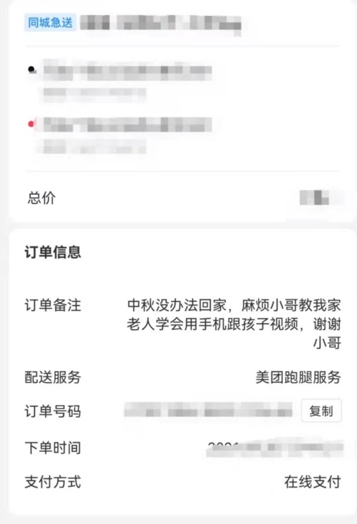美團(tuán)跑腿數(shù)據(jù)顯示,在跑腿訂單中有不少是請小哥幫助家中老人的內(nèi)容,最常見的訂單包括“上門調(diào)試電信網(wǎng)絡(luò)電視節(jié)目、教會(huì)老人開機(jī)選節(jié)目,謝謝”、“在樓下扶老人上樓謝謝”、“給老人取熬制好的中藥一袋,請跑腿帥哥注意行車安全!”、“麻煩幫助老人使用智能手機(jī),懂得怎么操作視頻通話就可以”……這些各種各樣的跑腿訂單里,滿滿都是愛意。