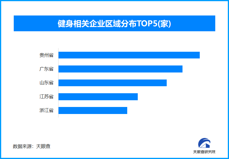 天眼查專業(yè)版數據顯示,截至目前,我國現存在業(yè)、存續(xù)狀態(tài)的健身相關企業(yè)超163.6萬家。從區(qū)域分布來看,貴州省、廣東省、山東省、江蘇省健身相關企業(yè)數量位居前列,四個省份數量總和超過59萬余家,占企業(yè)總數的36.07%。
