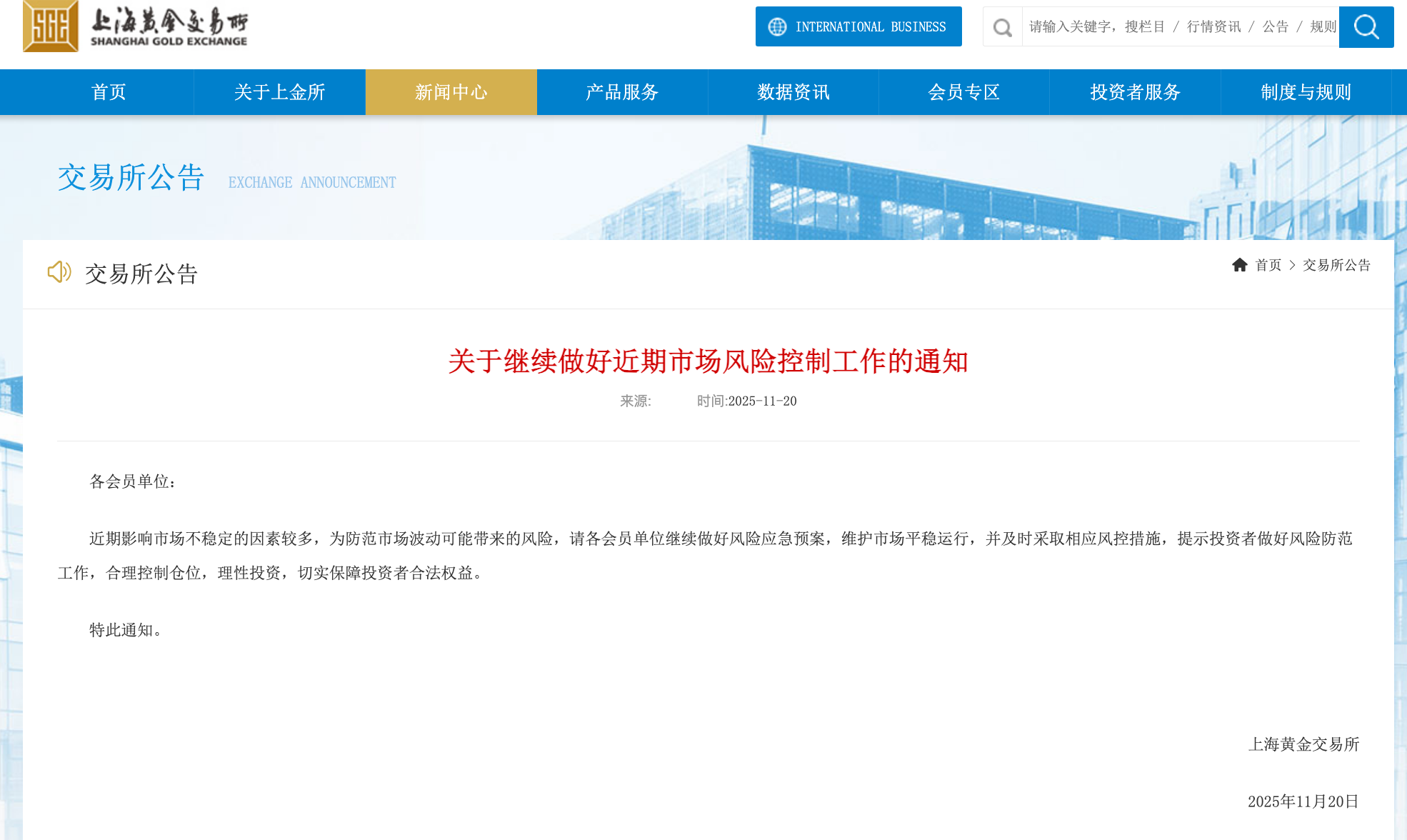 11月20日,上海黃金交易所發(fā)布《關(guān)于繼續(xù)做好近期市場風險控制工作的通知》(以下簡稱《通知》)?!锻ㄖ繁硎?,近期影響市場不穩(wěn)定的因素較多,為防范市場波動可能帶來的風險,請各會員單位繼續(xù)做好風險應(yīng)急預(yù)案,維護市場平穩(wěn)運行,并及時采取相應(yīng)風控措施,提示投資者做好風險防范工作,合理控制倉位,理性投資,切實保障投資者合法權(quán)益。