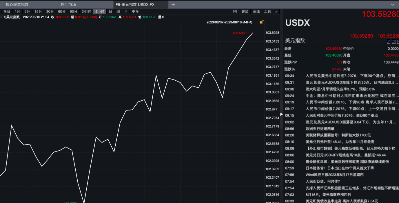 在紀(jì)要發(fā)布的當(dāng)日,美股三大指數(shù)全線收跌。其中納指連續(xù)第三個(gè)交易日跌超1%,截至收盤(pán),納指跌1.15%、道指跌0.52%、標(biāo)普500指數(shù)跌0.76%。美元指數(shù)則繼續(xù)上行,在“103”關(guān)口上方不斷沖高,盤(pán)中最高觸達(dá)103.5991點(diǎn)。