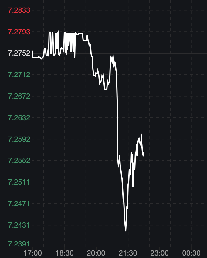 自9點(diǎn)宣布下調(diào)金融機(jī)構(gòu)外匯存款準(zhǔn)備金率公告發(fā)布后,據(jù)Wind數(shù)據(jù)顯示,更多反映國(guó)際投資者預(yù)期的離岸人民幣對(duì)美元匯率快速走高,從7.2665升破7.24關(guān)口僅用了約17分鐘,隨后有所回調(diào)。截至記者發(fā)稿,匯率圍繞7.25附近波動(dòng)。