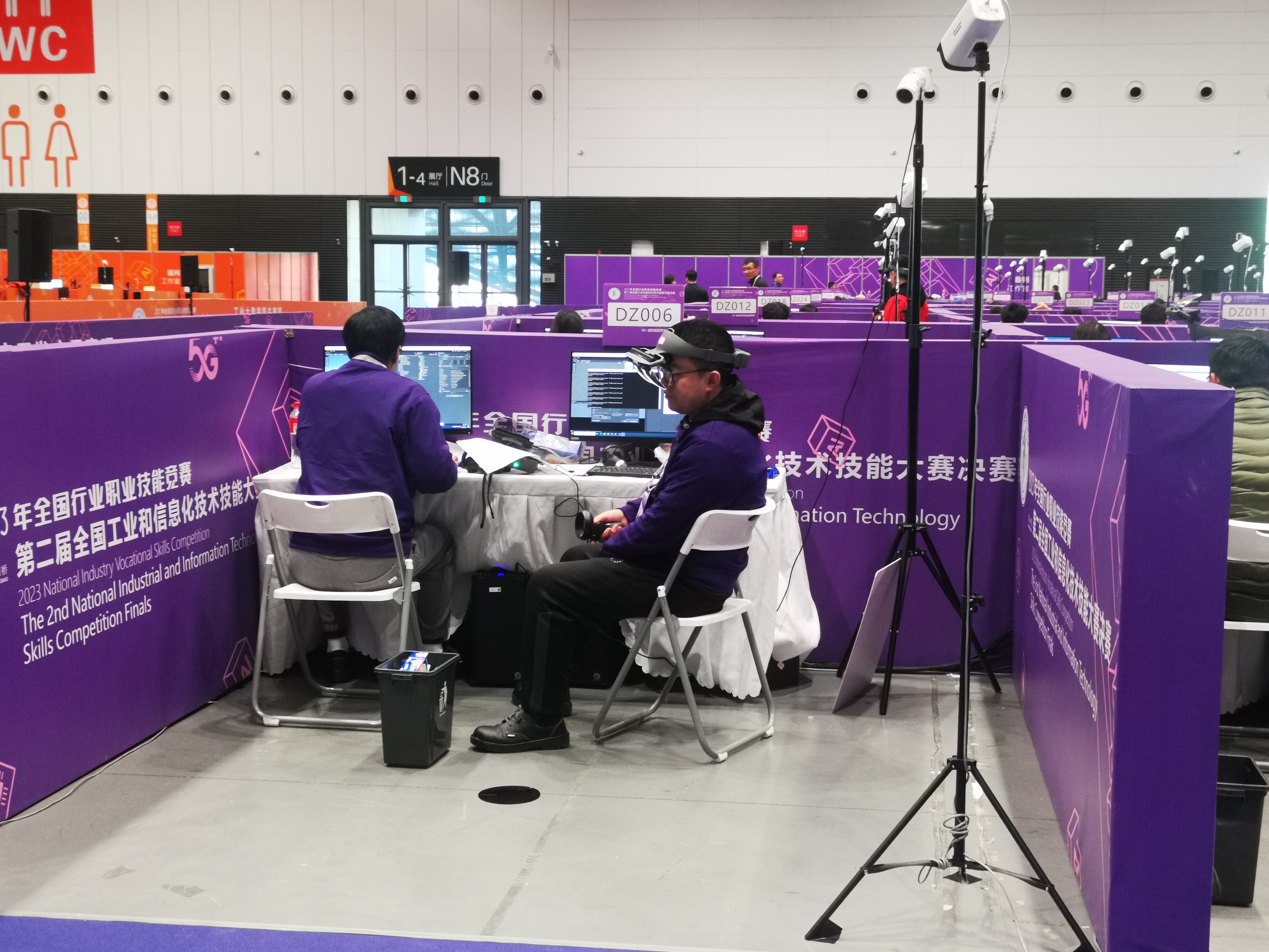 11月17日,在由工業(yè)和信息化部、人力資源社會(huì)保障部、教育部、中華全國(guó)總工會(huì)、共青團(tuán)中央共同主辦的2023年全國(guó)行業(yè)職業(yè)技能競(jìng)賽——第二屆全國(guó)工業(yè)和信息化技術(shù)技能大賽(下稱“技能大賽”)決賽現(xiàn)場(chǎng),5G+虛擬現(xiàn)實(shí)開(kāi)發(fā)應(yīng)用賽項(xiàng)正緊張進(jìn)行中,參賽選手不斷對(duì)頭顯設(shè)備進(jìn)行調(diào)試,按照要求設(shè)計(jì)場(chǎng)景。