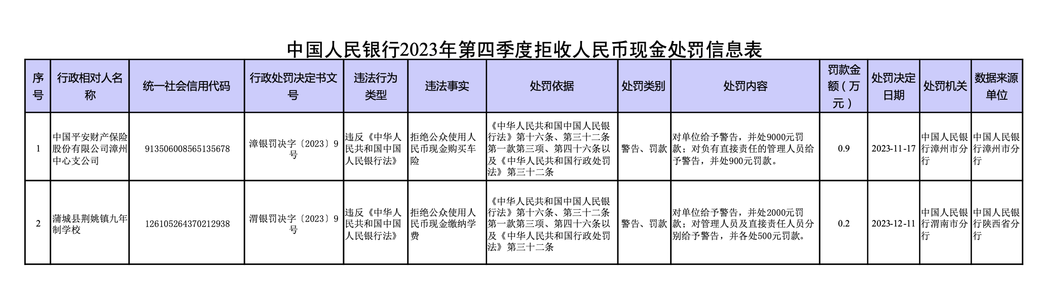 1月19日,中國人民銀行網(wǎng)站發(fā)布2023年第四季度拒收人民幣現(xiàn)金處罰情況。近期,中國人民銀行對兩家拒收人民幣現(xiàn)金的單位及相關(guān)責(zé)任人依法作出經(jīng)濟處罰。廣大經(jīng)營主體應(yīng)強化法治觀念,尊重公眾支付選擇權(quán),共同打造現(xiàn)金和諧流通環(huán)境。