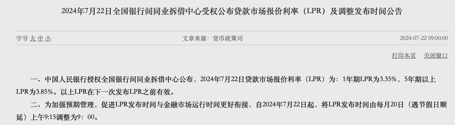 同時,央行表示,為加強預期管理,促進LPR發(fā)布時間與金融市場運行時間更好銜接,自2024年7月22日起,將LPR發(fā)布時間由每月20日(遇節(jié)假日順延)上午9:15調(diào)整為9:00。