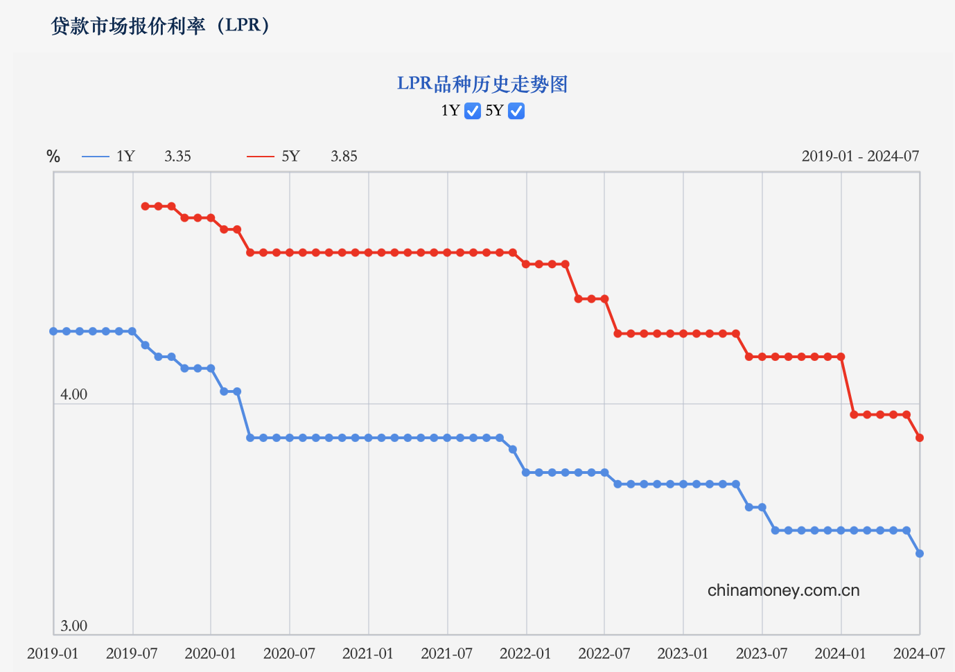 7月22日,新一期LPR(貸款市場報價利率)出爐。授權全國銀行間同業(yè)拆借中心公布,7月22日,1年期LPR為3.35%,5年期以上LPR為3.85%。兩個品種的報價均較前值下調(diào)10個基點。