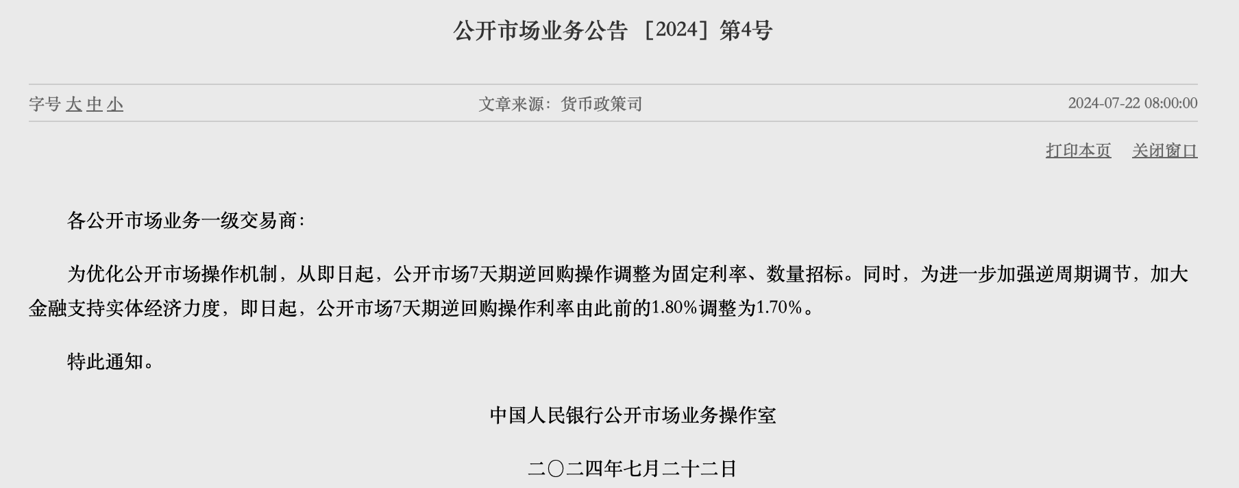 7月22日,中國人民銀行發(fā)布公告,為優(yōu)化公開市場操作機制,從即日起,公開市場7天期逆回購操作調(diào)整為固定利率、數(shù)量招標。同時,為進一步加強逆周期調(diào)節(jié),加大金融支持實體經(jīng)濟力度,即日起,公開市場7天期逆回購操作利率由此前的1.80%調(diào)整為1.70%。