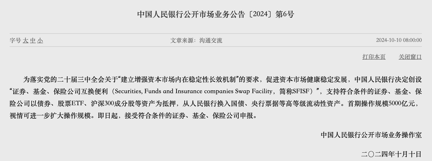 10月10日,中國(guó)人民銀行發(fā)布公告,為落實(shí)黨的二十屆三中全會(huì)關(guān)于“建立增強(qiáng)資本市場(chǎng)內(nèi)在穩(wěn)定性長(zhǎng)效機(jī)制”的要求,促進(jìn)資本市場(chǎng)健康穩(wěn)定發(fā)展,中國(guó)人民銀行決定創(chuàng)設(shè)“證券、基金、保險(xiǎn)公司互換便利(Securities,F(xiàn)unds and Insurance companies Swap Facility,簡(jiǎn)稱SFISF)”,支持符合條件的證券、基金、保險(xiǎn)公司以債券、股票ETF、滬深300成分股等資產(chǎn)為抵押,從人民銀行換入國(guó)債、央行票據(jù)等高等級(jí)流動(dòng)性資產(chǎn)。首期操作規(guī)模5000億元,視情可進(jìn)一步擴(kuò)大操作規(guī)模。即日起,接受符合條件的證券、基金、保險(xiǎn)公司申報(bào)。
