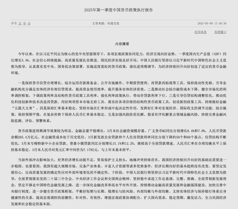 本報(bào)訊 (記者韓昱)5月9日,中國人民銀行發(fā)布《2025年第一季度中國貨幣政策執(zhí)行報(bào)告》(以下簡稱《報(bào)告》),《報(bào)告》指出,當(dāng)前外部沖擊影響加大,世界經(jīng)濟(jì)增長動能不足,貿(mào)易保護(hù)主義抬頭,地緣沖突持續(xù)存在,我國經(jīng)濟(jì)持續(xù)回升向好的基礎(chǔ)還需要進(jìn)一步穩(wěn)固。也要看到,我國有超大規(guī)模市場、完備產(chǎn)業(yè)體系、豐富人才資源等諸多優(yōu)勢條件,經(jīng)濟(jì)長期向好的基本趨勢沒有改變,要堅(jiān)定發(fā)展信心,以高質(zhì)量發(fā)展的確定性應(yīng)對外部環(huán)境變化的不確定性。