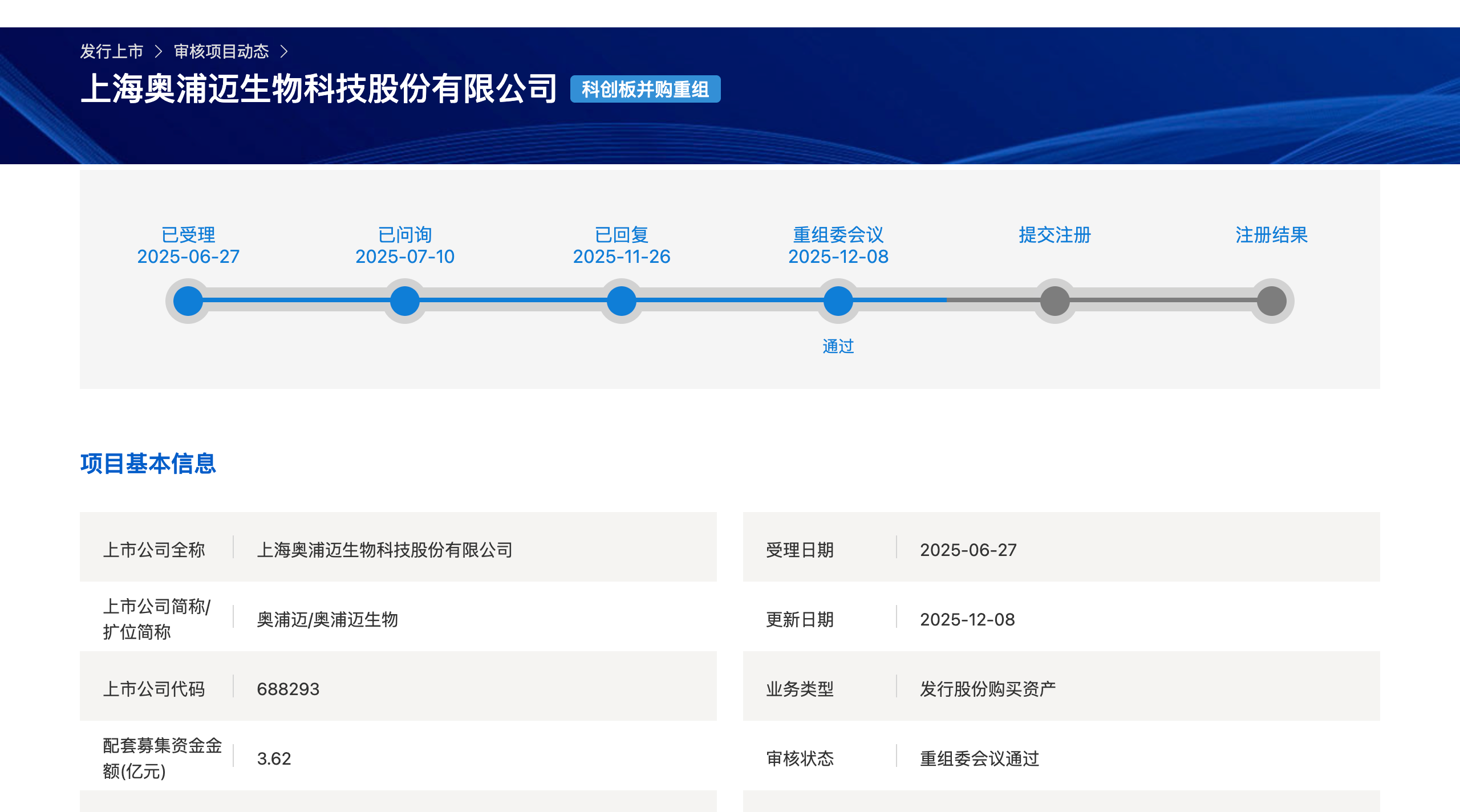 本報訊 (記者毛藝融)12月8日,上海奧浦邁生物科技股份有限公司(以下簡稱“奧浦邁”)發(fā)行股份購買資產(chǎn)申請獲上海證券交易所并購重組委審議通過。