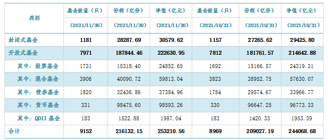 截至2021年11月底,我國公募基金資產(chǎn)管理規(guī)模合計為25.32萬億元,較10月底的24.41萬億元增長3.73%;公募基金數(shù)量合計9152只,較10月底的8969只增加183只。