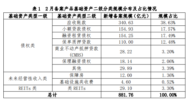 按基礎(chǔ)資產(chǎn)一級(jí)分類,2月份債權(quán)類產(chǎn)品新增備案規(guī)模836.06億元;REITs類產(chǎn)品新增備案規(guī)模29.10億元;未來(lái)經(jīng)營(yíng)性收入類產(chǎn)品新增備案規(guī)模16.60億元。按基礎(chǔ)資產(chǎn)二級(jí)分類,小額貸款債權(quán)、應(yīng)收賬款、融資租賃債權(quán)、商業(yè)不動(dòng)產(chǎn)抵押貸款(CMBS)新增備案規(guī)模合計(jì)占月度備案產(chǎn)品新增備案規(guī)模的76.90%,較上月減少7.99%。