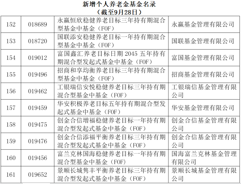 10月20日晚,中國證券投資基金業(yè)協(xié)會(以下簡稱“中基協(xié)”)發(fā)布的個人養(yǎng)老金基金名錄和個人養(yǎng)老金基金銷售機(jī)構(gòu)名錄顯示,截至今年9月28日,個人養(yǎng)老金基金數(shù)量達(dá)161只、個人養(yǎng)老金基金銷售機(jī)構(gòu)數(shù)量為48家,相比二季度分別新增10只、3家。