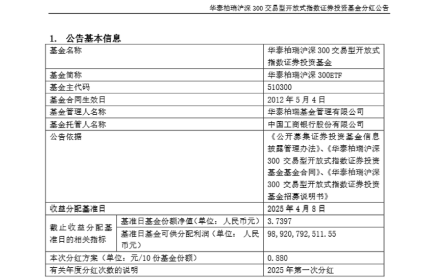 6月11日,華泰柏瑞基金發(fā)布公告稱(chēng),旗下滬深300ETF將實(shí)施現(xiàn)金分紅,分紅方案為每10份基金份額分紅0.880元,分紅權(quán)益登記日為2025年6月17日,除息日為2025年6月18日,現(xiàn)金紅利發(fā)放日為2025年6月27日。