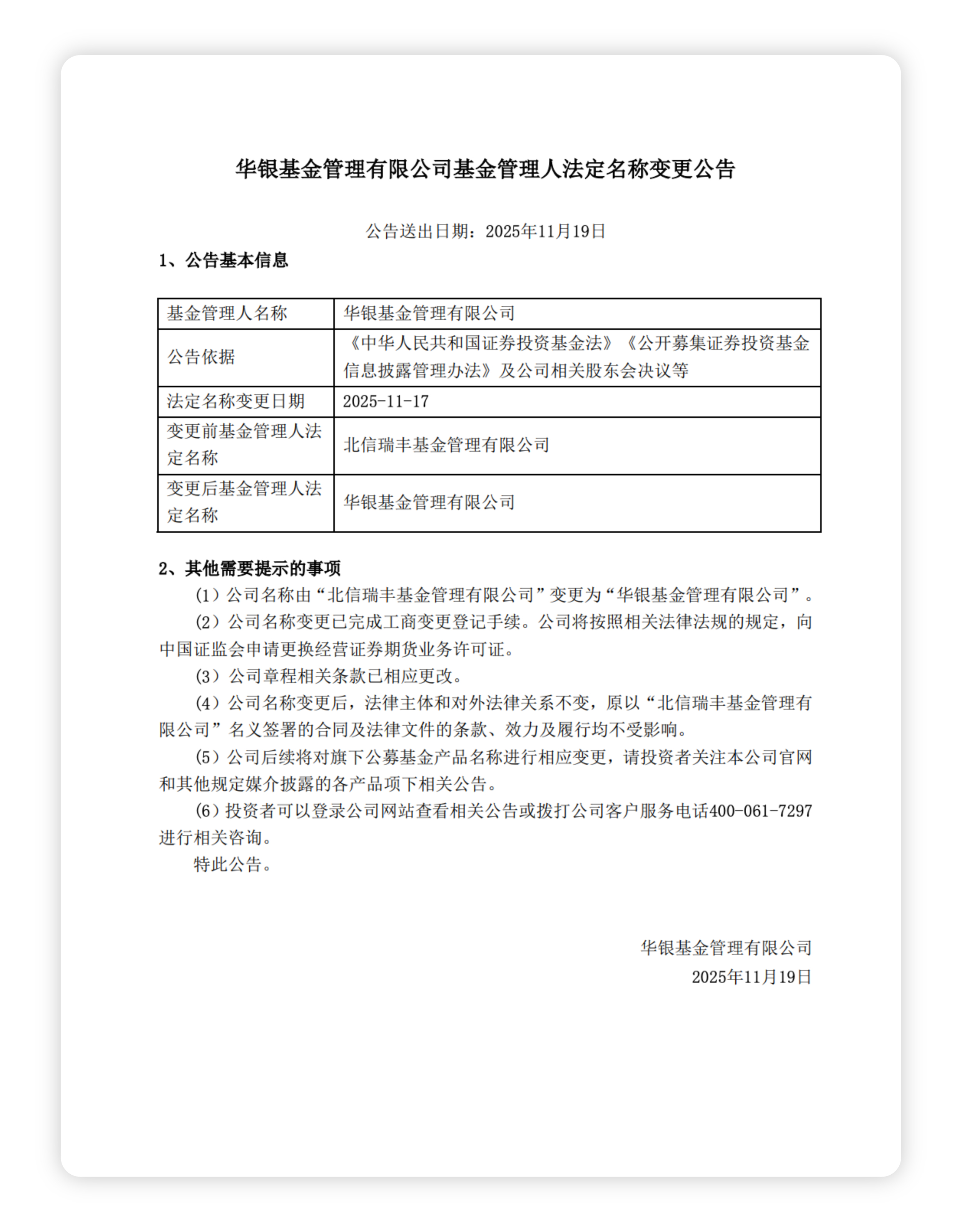 本報訊 (記者彭衍菘)11月19日,原北信瑞豐基金管理有限公司公告稱,公司名稱變更為“華銀基金管理有限公司”(以下簡稱“華銀基金”)。