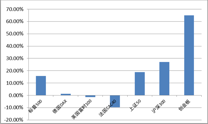 2020年的新冠疫情造成了巨大的沖擊,各國央行為應(yīng)對經(jīng)濟下滑積極釋放流動性,但因為隔離等防疫政策導致的制造業(yè)停滯,大量無處可去的資金流入了資本市場。我們看到,全球股市在一季度大跌之后,均陸續(xù)開啟反彈行情,其中A股依靠更快的基本面復(fù)蘇表現(xiàn)亮眼。全年來看,標普500上漲15.62%,德國DAX也累計微漲1.28%,但同期英國富時100和法國CAC40仍累計下跌1.54%和9.78%。得益于中國對疫情的成功控制和順利復(fù)工復(fù)產(chǎn)所帶來的基本面優(yōu)勢,上證50、滬深300和創(chuàng)業(yè)板在2020年分別上漲18.85%、27.21%和64.96%,在全球市場中名列前茅。