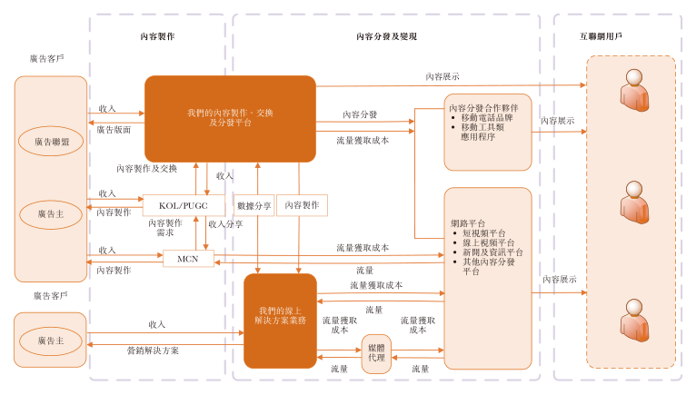 云想科技是國內(nèi)領(lǐng)先的大數(shù)據(jù)短視頻營銷解決方案供應商及集中于泛娛樂的線上內(nèi)容服務供應商。根據(jù)艾瑞咨詢,2019年,就直接透過短視頻平臺出售產(chǎn)品或服務的電商公司的廣告的用戶流量消耗量而言,云想科技是中國最大的短視頻營銷解決方案供應商,獲取用戶流量消耗量超過人民幣10億元。按短視頻廣告所產(chǎn)生的總賬單計算,云想科技是中國第三大在線營銷解決方案供應商,市場份額為3.4%。同時,按2019年中國平均DAU計算,云想科技在所有泛娛樂信息網(wǎng)站中排名第一。