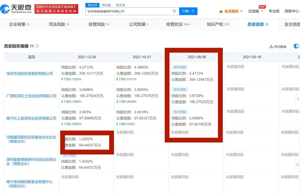 根據(jù)天眼查APP顯示,深圳市創(chuàng)新投資集團(tuán)有限公司、廣西桂深紅土創(chuàng)業(yè)投資有限公司、南寧紅土邕深創(chuàng)業(yè)投資有限公司首次參股時間為2021年8月6日,河南盛周股權(quán)投資基金合伙企業(yè)(有限合伙)首次參股時間為2021年12月24號。本次交易后上述公司將不再持有恒保健康股權(quán)。