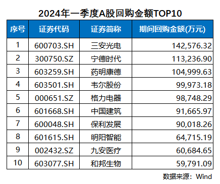 2024年以來,A股支持回購力度持續(xù)加大,回購金額創(chuàng)新高。Wind數(shù)據(jù)顯示,2024年第一季度有1275家A股上市公司已經(jīng)實(shí)施了回購,已回購金額總計(jì)約578億元。其中,第一季度已回購金額超過10億元的上市公司有3家,藥明康德以約10.5億元回購規(guī)模位列醫(yī)藥板塊第一。