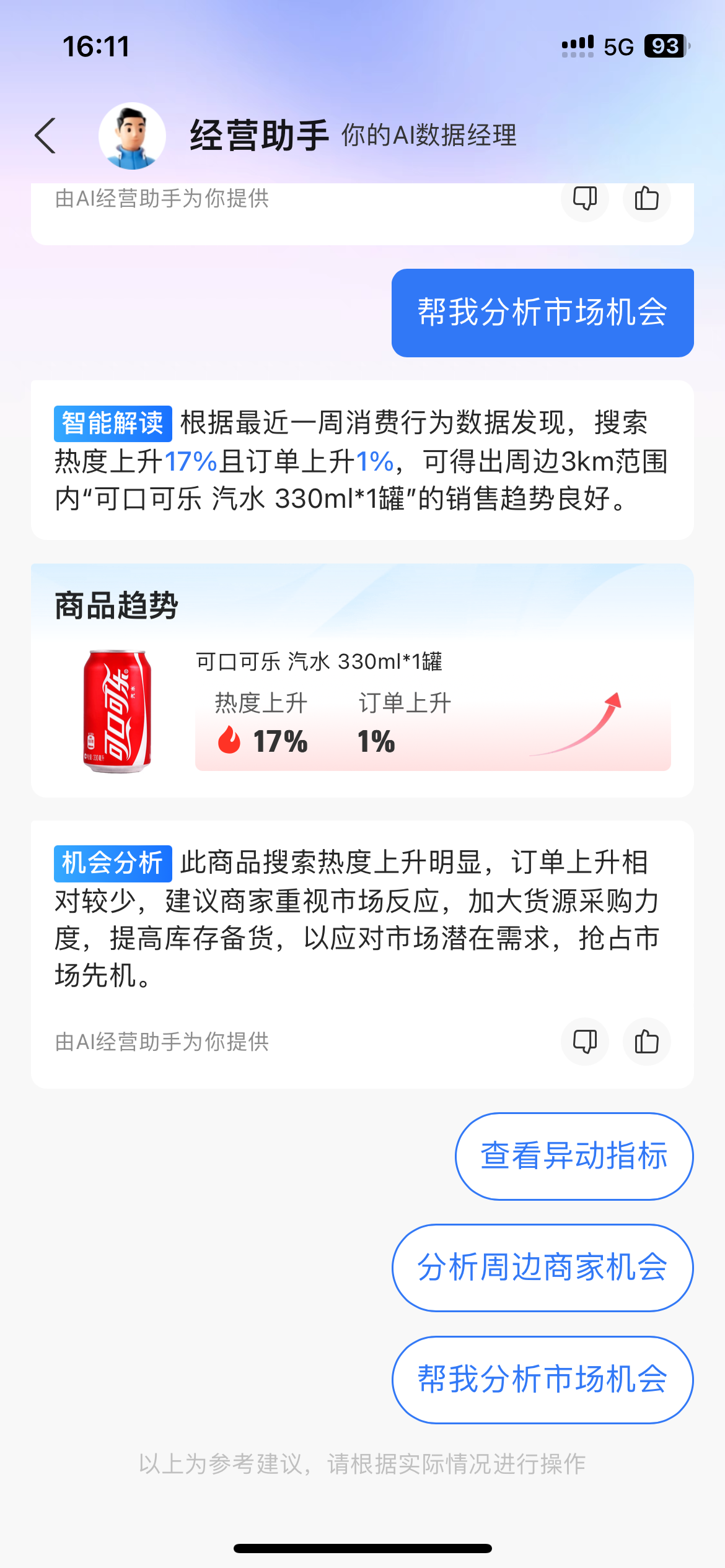 這款由人工智能技術驅動的經營管理工具,集成了先進的自然語言處理、智能決策支持以及深度學習能力,可以為商家提供包括周報推送、指標異動歸因、競對商家對齊、市場趨勢選品等在內的全方位經營服務。