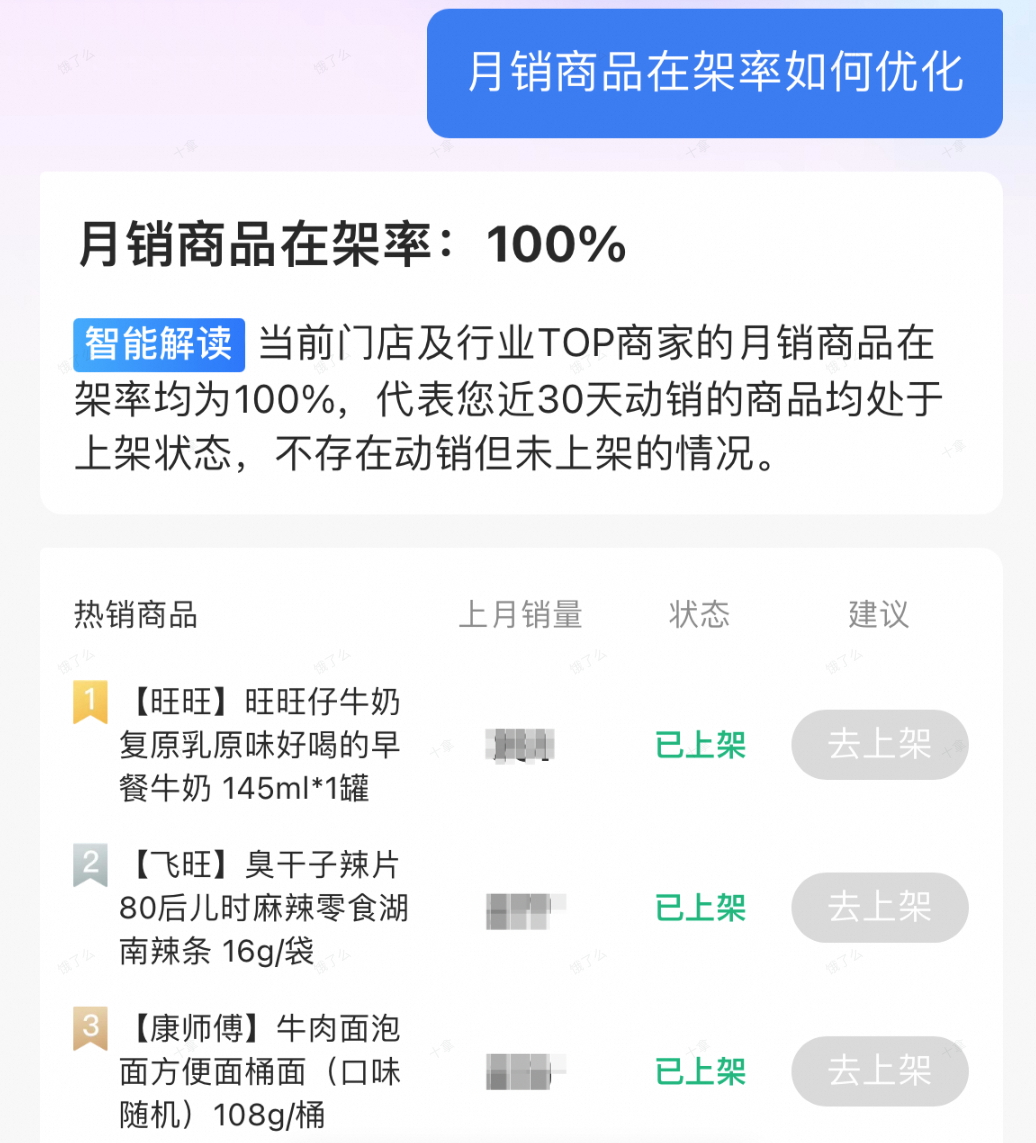據介紹,通過“AI經營助手”,商家可以根據具體門店查詢對應商圈,找到周邊經營TOP門店,在月銷商品在架率、缺貨退數率、商品低價率、履約及時率、人工回復及時率五個方面進行比對。這些分析可以為門店管理者提供運營優(yōu)化建議和訂單增長的途徑。