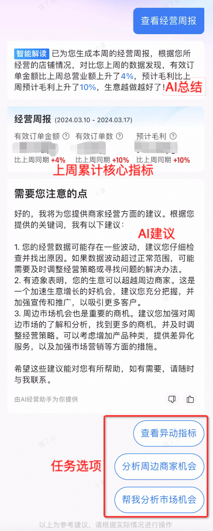 “AI經營助手”生成的智能周報,不僅包括店鋪的有效訂單金額、有效訂單數、店鋪預計毛利等核心指標,還包括了人工智能基于商家經營情況提供的智能解讀和整體經營建議。例如通過經營異動指標,“AI經營助手”會根據商家歷史數據判斷出哪些指標可能會出現異常,商家可以看到關于店鋪凈銷量、上架商品數、配送費原價、平臺承擔配送費活動費用的數據波動,進一步查看數據的波動原因,并據此進行經營策略的調整。
