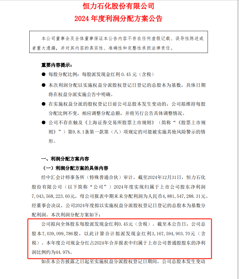 據(jù)恒力石化同步披露的利潤分配預(yù)案,公司擬向全體股東每10股派發(fā)現(xiàn)金紅利4.5元(含稅),合計擬派發(fā)現(xiàn)金紅利31.68億元(含稅),占公司2024年合并報表中歸屬于上市公司普通股股東的凈利潤的44.97%。按該公司最新收盤價15.5元/股算,股息率達到2.9%。
