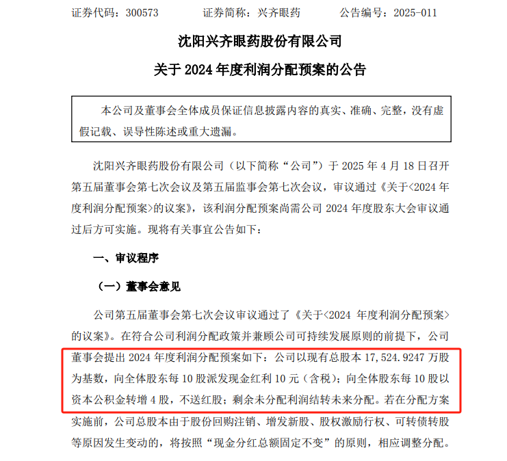 4月21日晚間,據(jù)興齊眼藥披露的利潤分配預(yù)案,2024年期末,公司擬向全體股東每10股派發(fā)現(xiàn)金紅利10元(含稅);擬向全體股東每10股以資本公積金轉(zhuǎn)增4股。此次利潤分配,興齊眼藥合計(jì)將派發(fā)股利1.75億元。加上2024年中期公司派發(fā)的8721.24萬元,興齊眼藥2024年度合計(jì)將派發(fā)股利2.62億元,占公司當(dāng)年實(shí)現(xiàn)的歸屬于上市公司股東的凈利潤的77.64%。
