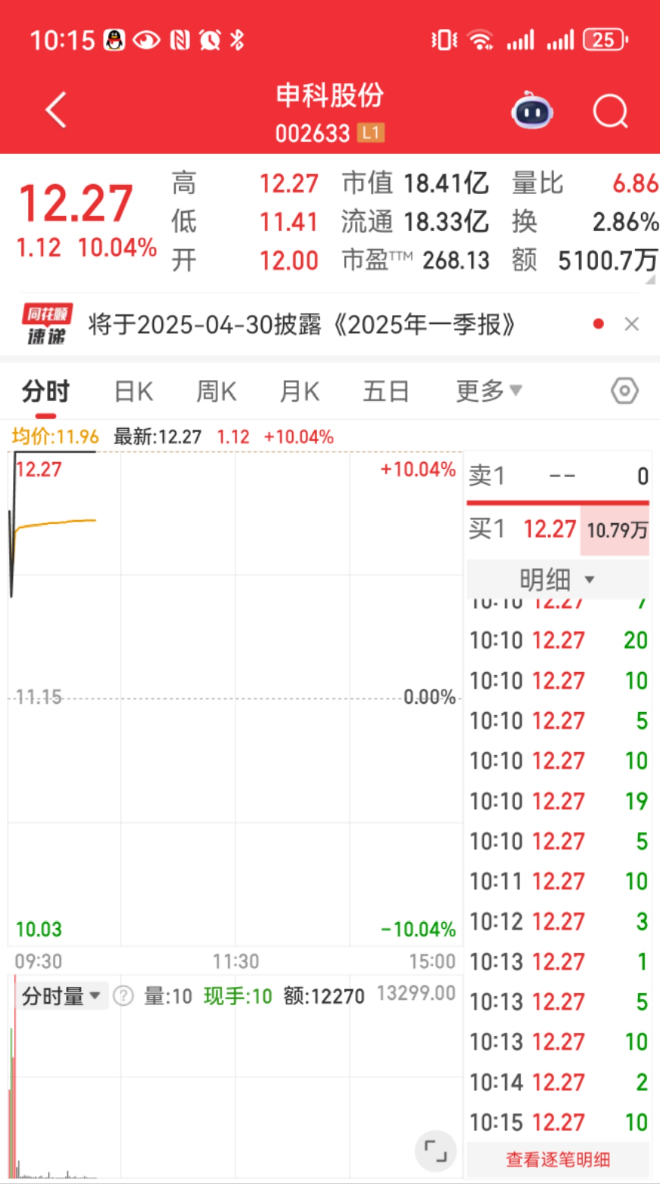4月29日,申科股份開(kāi)盤三分鐘迅速漲停,9:33分即報(bào)12.27元/股。