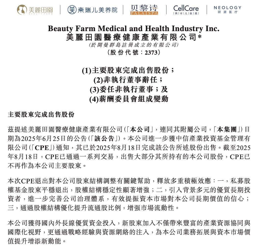 8月18日,美麗田園醫(yī)療健康產(chǎn)業(yè)有限公司(以下簡(jiǎn)稱“美麗田園”)宣布,已接獲中信產(chǎn)業(yè)投資基金管理有限公司(以下簡(jiǎn)稱“CPE”)通知,截至8月18日,CPE已順利完成5132.9萬股公司股份的出售交割。截至目前,CPE已不再作為公司主要股東。