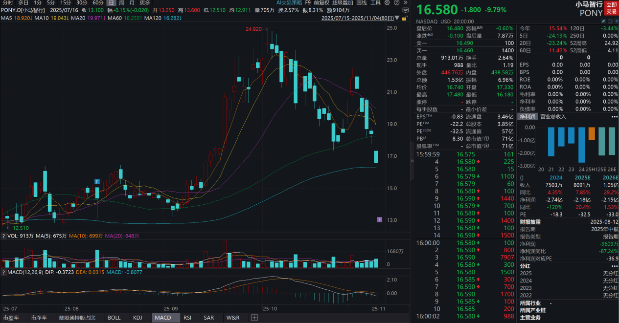 實際上,自10月2日小馬智行股價創(chuàng)下歷史新高24.92美元/股后,截至美國當(dāng)?shù)貢r間11月4日,其股價回調(diào)幅度已超過33%。