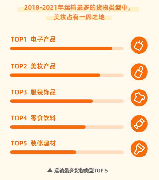 另一方面,2018-2021年間,電子產(chǎn)品仍是華強(qiáng)北運(yùn)輸最多的貨物品類(lèi),持續(xù)享譽(yù)“中國(guó)電子第一街”的稱號(hào),但美妝產(chǎn)品運(yùn)輸量的表現(xiàn)也突出,僅次于電子產(chǎn)品。
