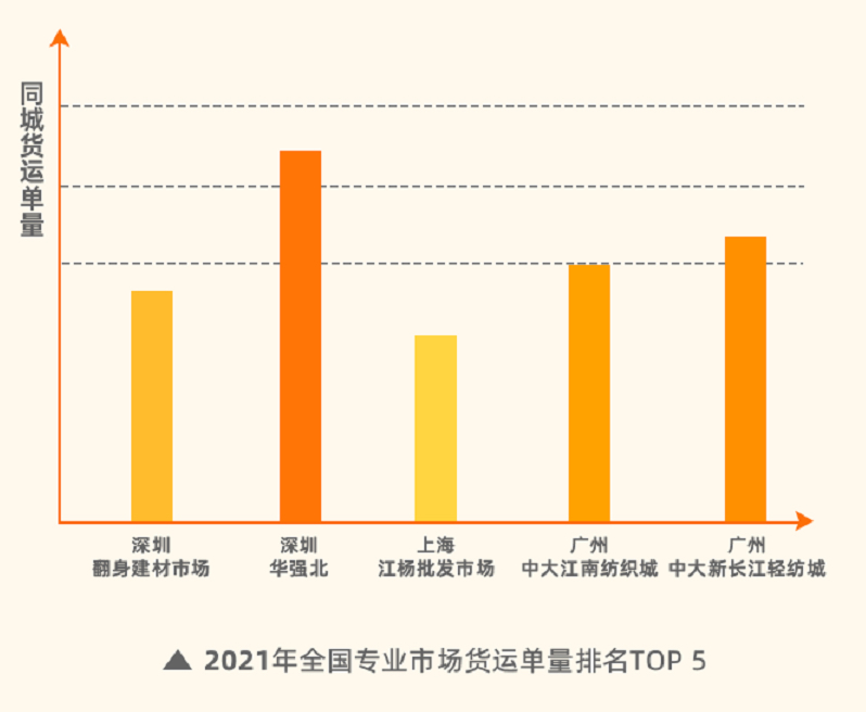 2019-2021年,華強(qiáng)北在全國(guó)專(zhuān)業(yè)市場(chǎng)同城貨運(yùn)單量排名里蟬聯(lián)第一,廣州中大新長(zhǎng)江輕紡城則穩(wěn)居第二。其中,廣州重大江南紡織城、深圳翻身建材市場(chǎng)也連續(xù)3年進(jìn)入排名前5名,貨運(yùn)量穩(wěn)定。
