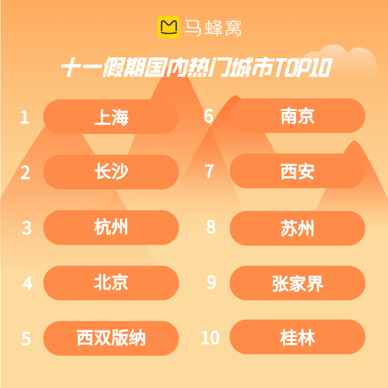 馬蜂窩玩樂數(shù)據(jù)顯示,上海、長沙、杭州、北京、西雙版納、南京、西安、蘇州、張家界、桂林位列十一黃金周關(guān)注度最高的城市前十,本地和周邊游客為目的地?zé)岫茸龀隽酥饕暙I(xiàn)。不遠(yuǎn)行的假期,能夠感受文化熏陶的深度體驗成為更多年輕人的選擇。沿北京的中軸線騎行,去杭州良渚文化遺址公園秋游,在南京牛首山的佛頂宮等地感受佛教文化,都是本地游客熱衷的文化打卡形式。