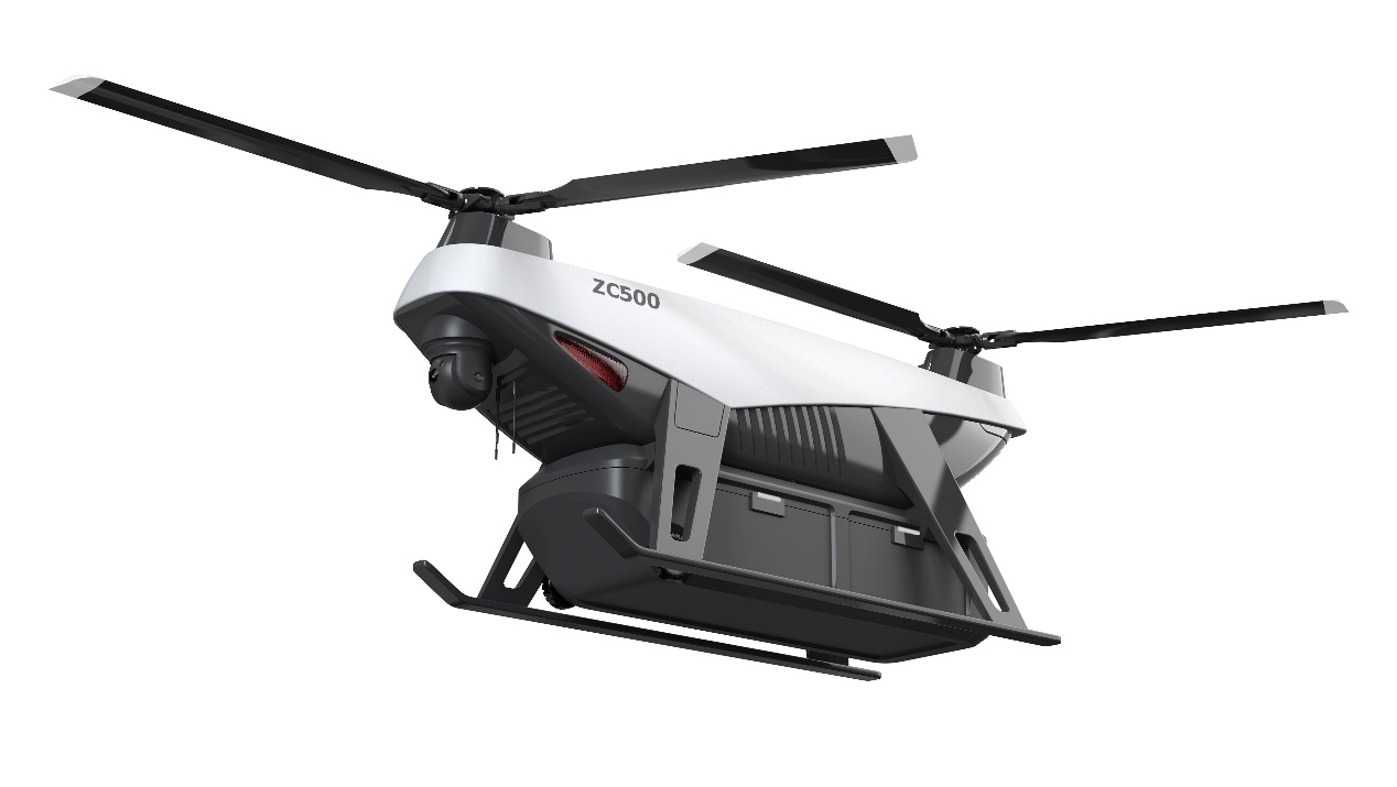 其中,ZC500型縱列式雙旋翼無人機,是公司歷時7年研發(fā)、測試,推出的一款多用途無人直升機。縱列雙旋翼構(gòu)型的主要優(yōu)點是縱向重心范圍大,因此機身掛載空間大,尤其在物資投送方面具有顯著優(yōu)勢。相比其他構(gòu)型的直升機來說,通常對于貨物掛載有嚴格要求,更換負荷或者調(diào)整掛載位置后需要重新配平重心。重心偏差對于常規(guī)構(gòu)型直升機來說是非常危險的因素,這給用戶使用帶來非常大的困擾。