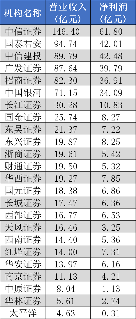 公司方面,“冠軍老將”中信證券依舊取得營收和凈利潤的雙料冠軍,實現(xiàn)凈利潤61.8億元,實現(xiàn)營業(yè)收入146.4億元。