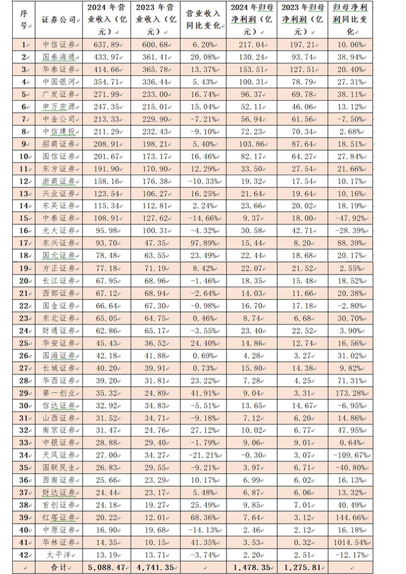 42家上市券商營(yíng)業(yè)收入及歸母凈利潤(rùn)情況