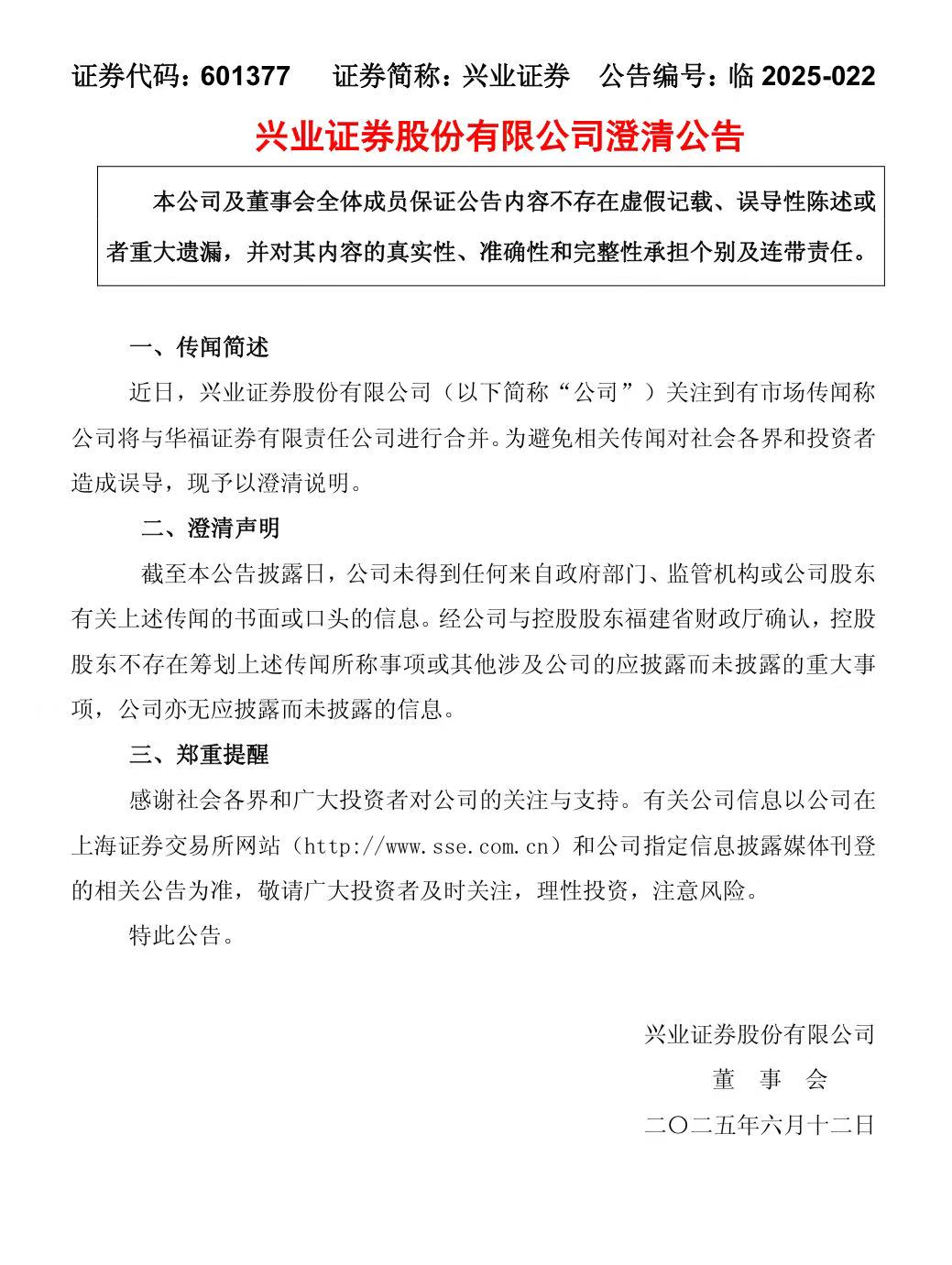 6月11日晚間,興業(yè)證券(601377.SH)發(fā)布公告稱,近日,公司關(guān)注到有市場(chǎng)傳聞稱公司將與華福證券進(jìn)行合并。為避免相關(guān)傳聞對(duì)社會(huì)各界和投資者造成誤導(dǎo),現(xiàn)予以澄清說(shuō)明。