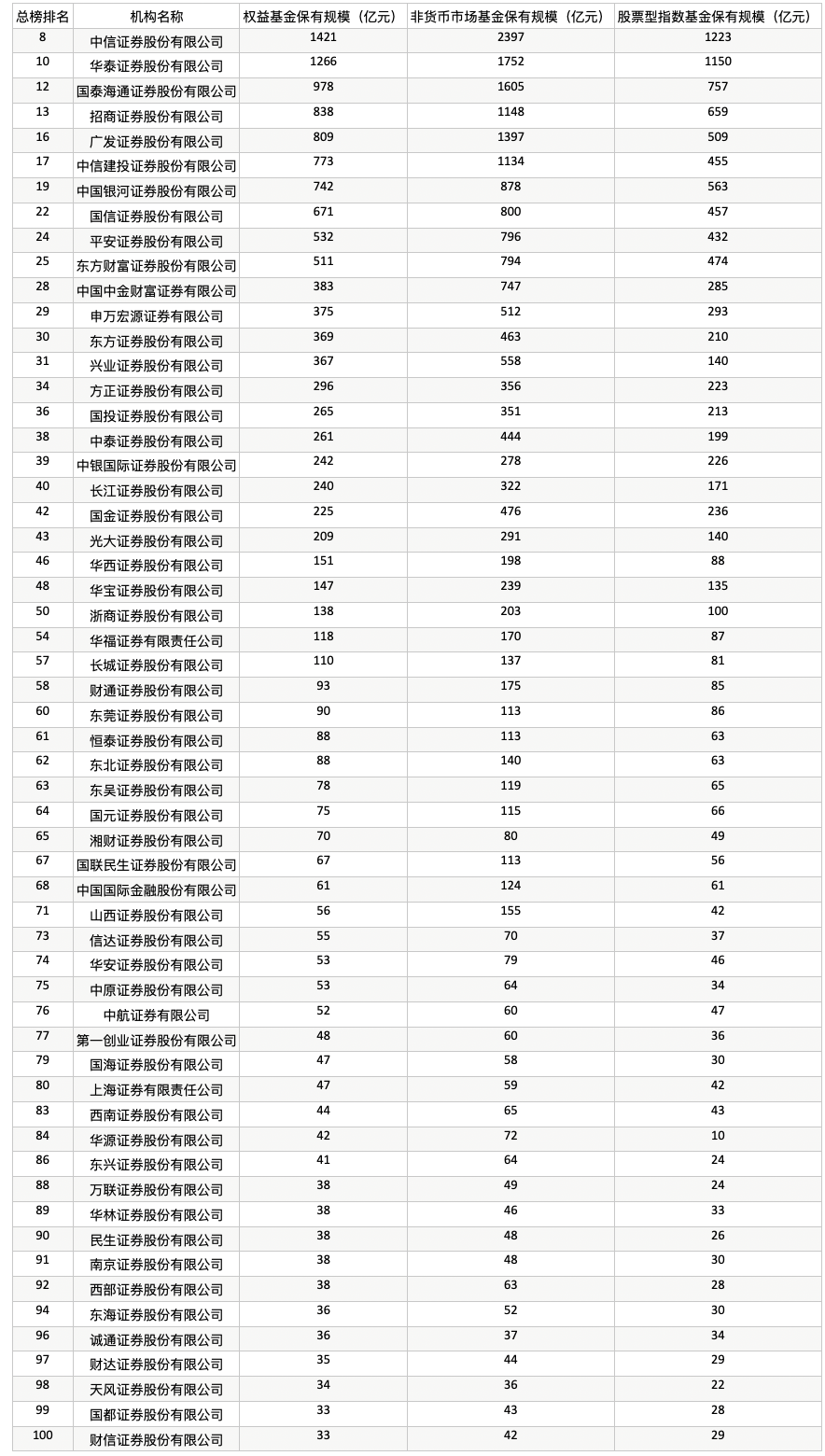 在“權(quán)益基金保有規(guī)模”方面,中信證券以1421億元的保有規(guī)模在券商中獨占鰲頭;華泰證券緊隨其后,保有規(guī)模為1266億元。此外,國泰海通、招商證券、廣發(fā)證券、中信建投、中國銀河、國信證券、平安證券以及東方財富證券的保有規(guī)模均超過500億元。