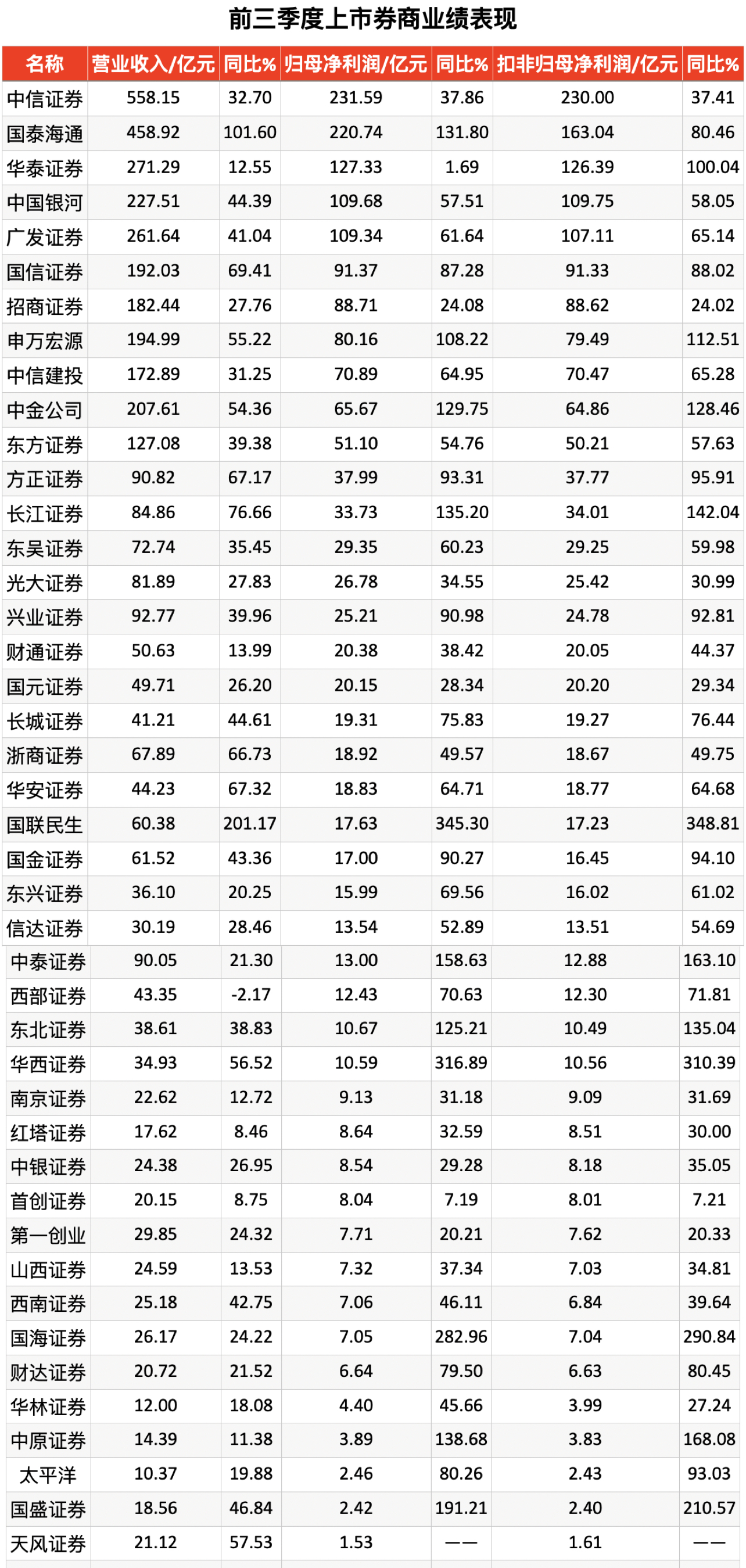 深入剖析前三季度上市券商的業(yè)績表現(xiàn),在43家上市券商中,有42家券商的營業(yè)收入和歸母凈利潤均實(shí)現(xiàn)了同比正增長,呈現(xiàn)出“雙增長”的良好局面;中信證券、國泰海通、華泰證券、廣發(fā)證券、中國銀河、中金公司等實(shí)力強(qiáng)勁的頭部券商,營業(yè)收入均突破200億元大關(guān),中信證券、國泰海通、華泰證券、中國銀河、廣發(fā)證券等5家券商的歸母凈利潤均超百億元。