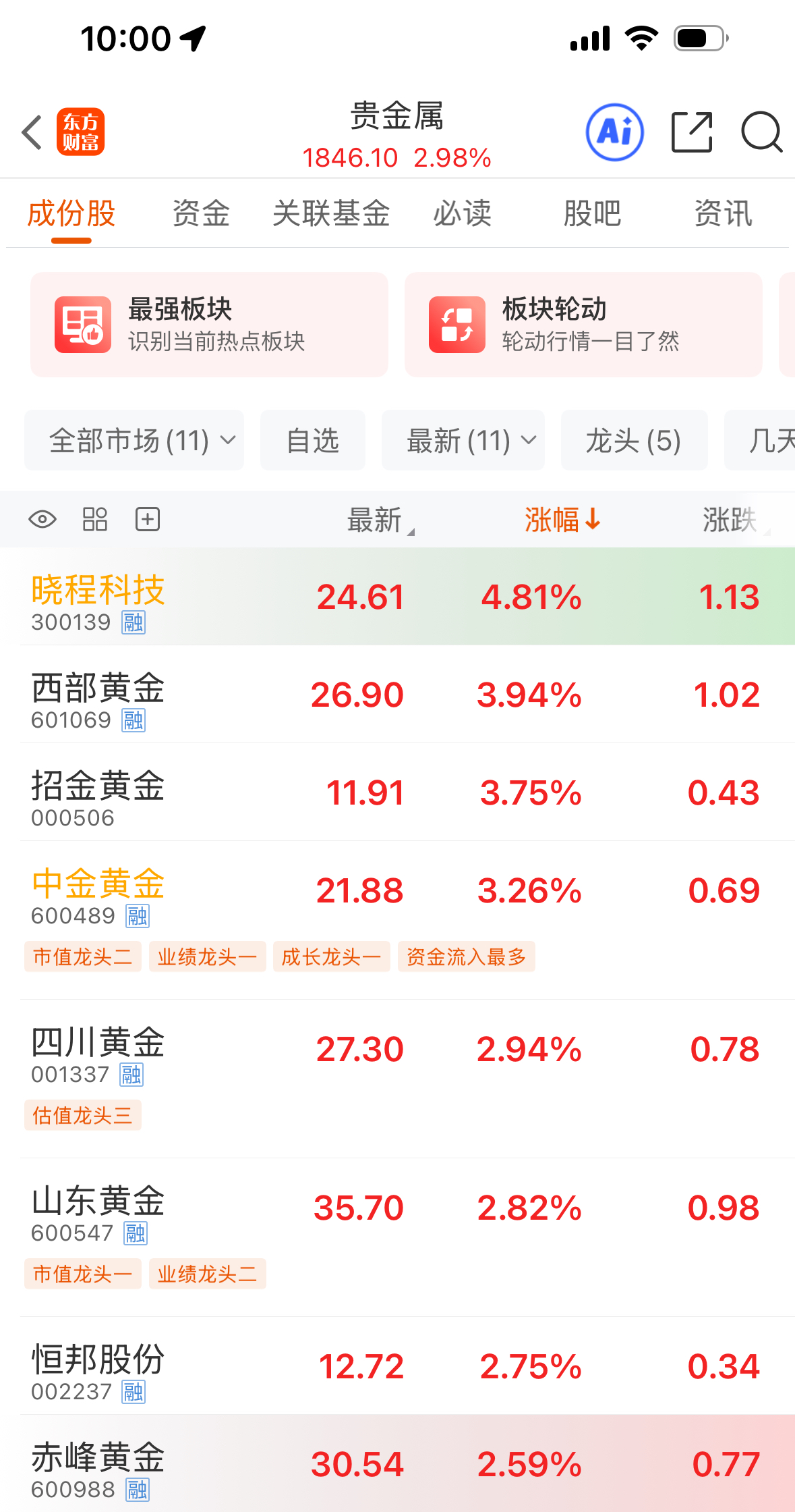 受金價(jià)上漲提振,A股早間開盤,貴金屬板塊競(jìng)價(jià)高開,截至記者10點(diǎn)發(fā)稿時(shí),東方財(cái)富軟件數(shù)據(jù)顯示,貴金屬板塊指數(shù)大漲2.98%,全板塊11只個(gè)股悉數(shù)飄紅;成分股中,曉程科技漲逾4%,中金黃金、西部黃金、招金黃金漲逾3%。