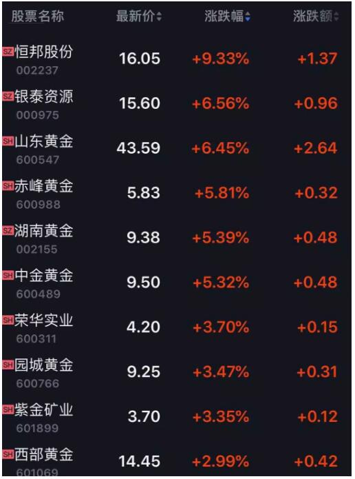 3、避險(xiǎn)情緒升溫黃金概念股拉升恒邦股份漲逾9%,銀泰資源、山東黃金漲逾6%,湖南黃金、赤峰黃金、中金黃金等紛紛跟漲。