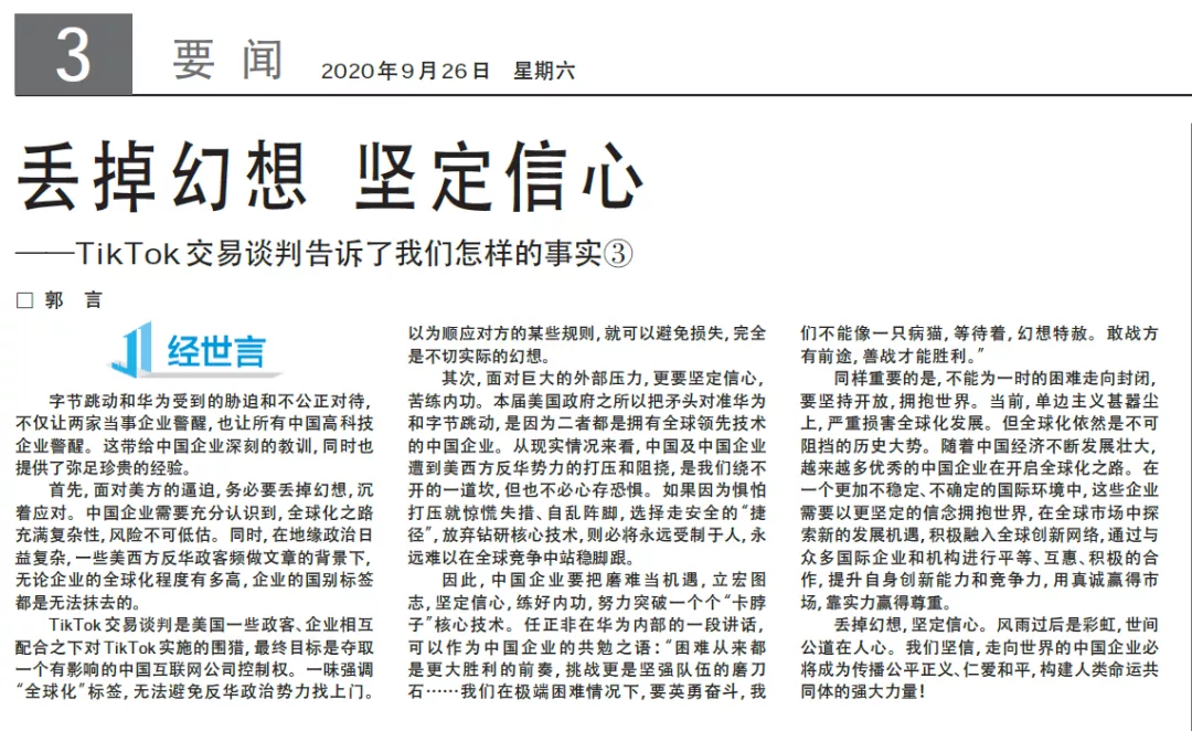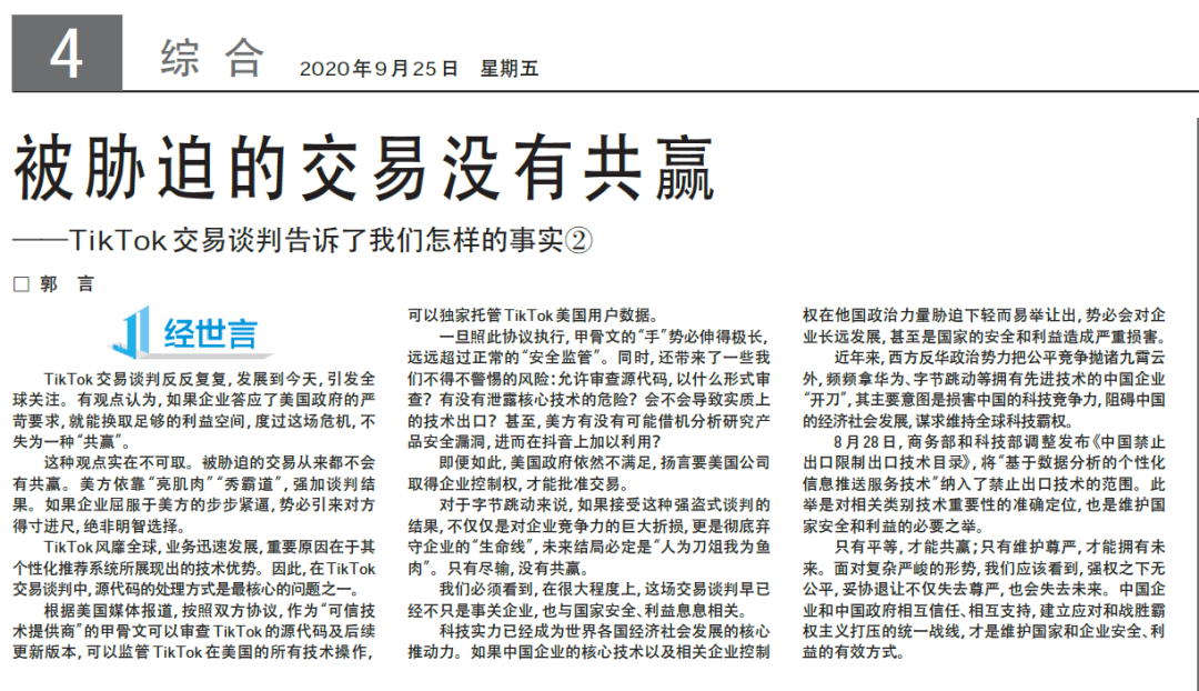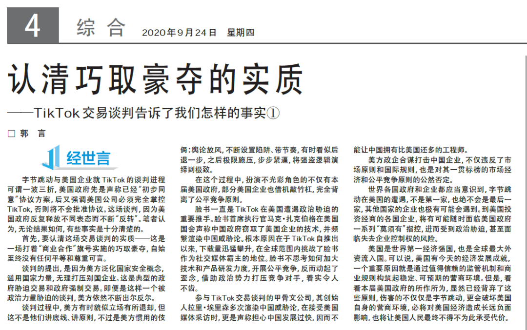 TikTok在美交易談判反反復(fù)復(fù),全球關(guān)注。近日,經(jīng)濟日報推出三篇重磅評論——《認清巧取豪奪的實質(zhì)》《被脅迫的交易沒有共贏》《丟掉幻想堅定信心》,深度解讀這場談判的事實和真相。