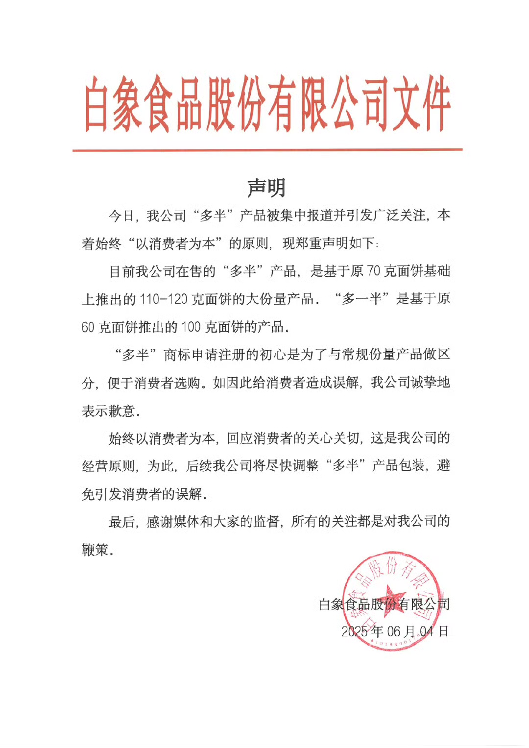 6月4日晚,白象食品發(fā)布聲明稱,目前公司在售的“多半”產品,是基于原70克面餅基礎上推出的110—120克面餅的大份量產品。“多一半”是基于原60克面餅推出的100克面餅的產品。“多半”商標申請注冊的初心是為了與常規(guī)份量產品做區(qū)分,便于消費者選購。白象食品表示,后續(xù)公司將盡快調整“多半”產品包裝,避免引發(fā)消費者的誤解。