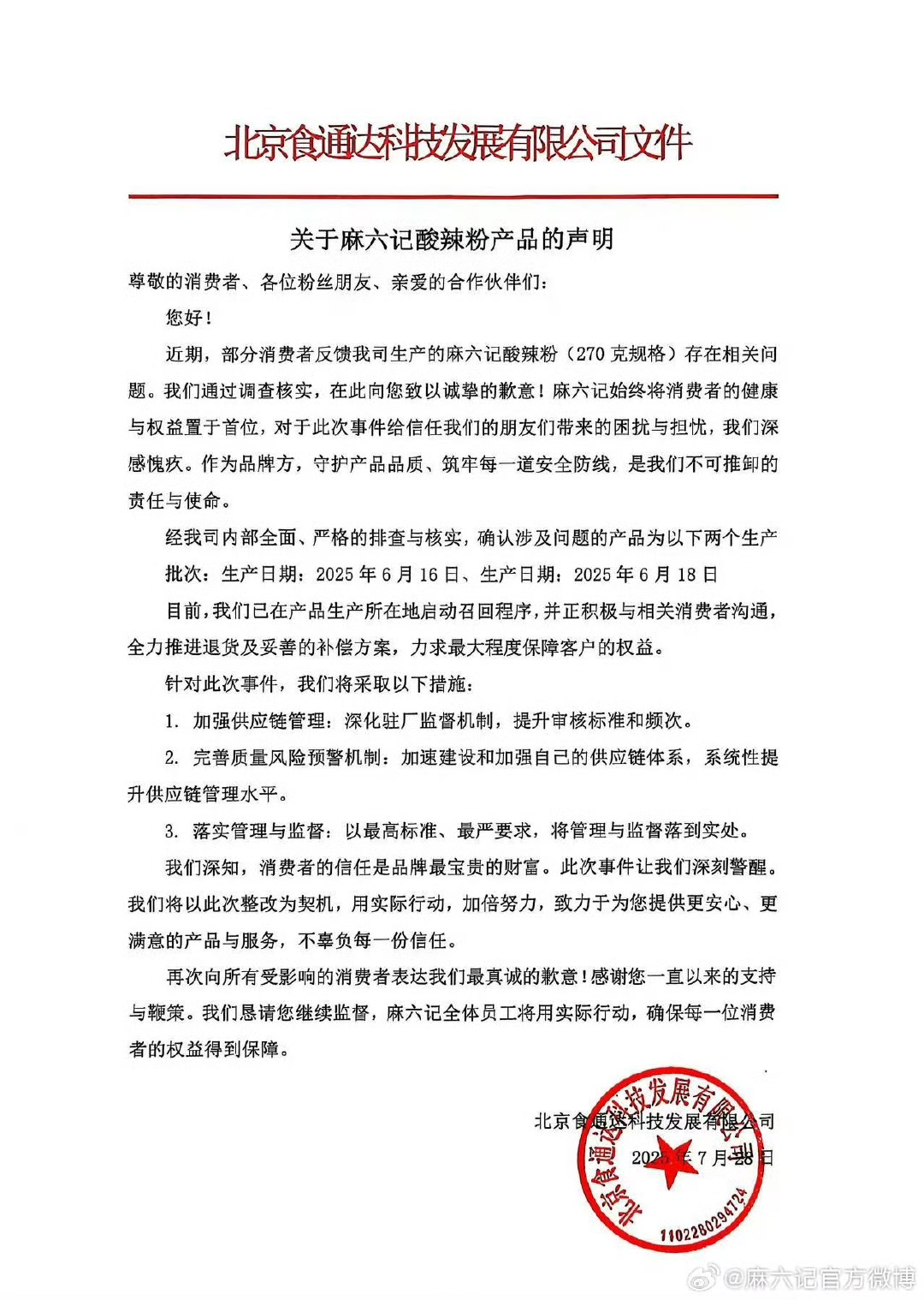 本報(bào)訊 (記者李靜)7月28日下午,麻六記官方微博發(fā)表聲明道歉,稱經(jīng)公司內(nèi)部排查與核實(shí),確認(rèn)涉及問(wèn)題的產(chǎn)品為生產(chǎn)日期為2025年6月16日、6月18日的兩個(gè)生產(chǎn)批次。麻六記稱,目前,公司已在產(chǎn)品生產(chǎn)所在地啟動(dòng)召回程序,并正積極與相關(guān)消費(fèi)者溝通,全力推進(jìn)退貨及妥善的補(bǔ)償方案,力求最大程度保障客戶的權(quán)益。